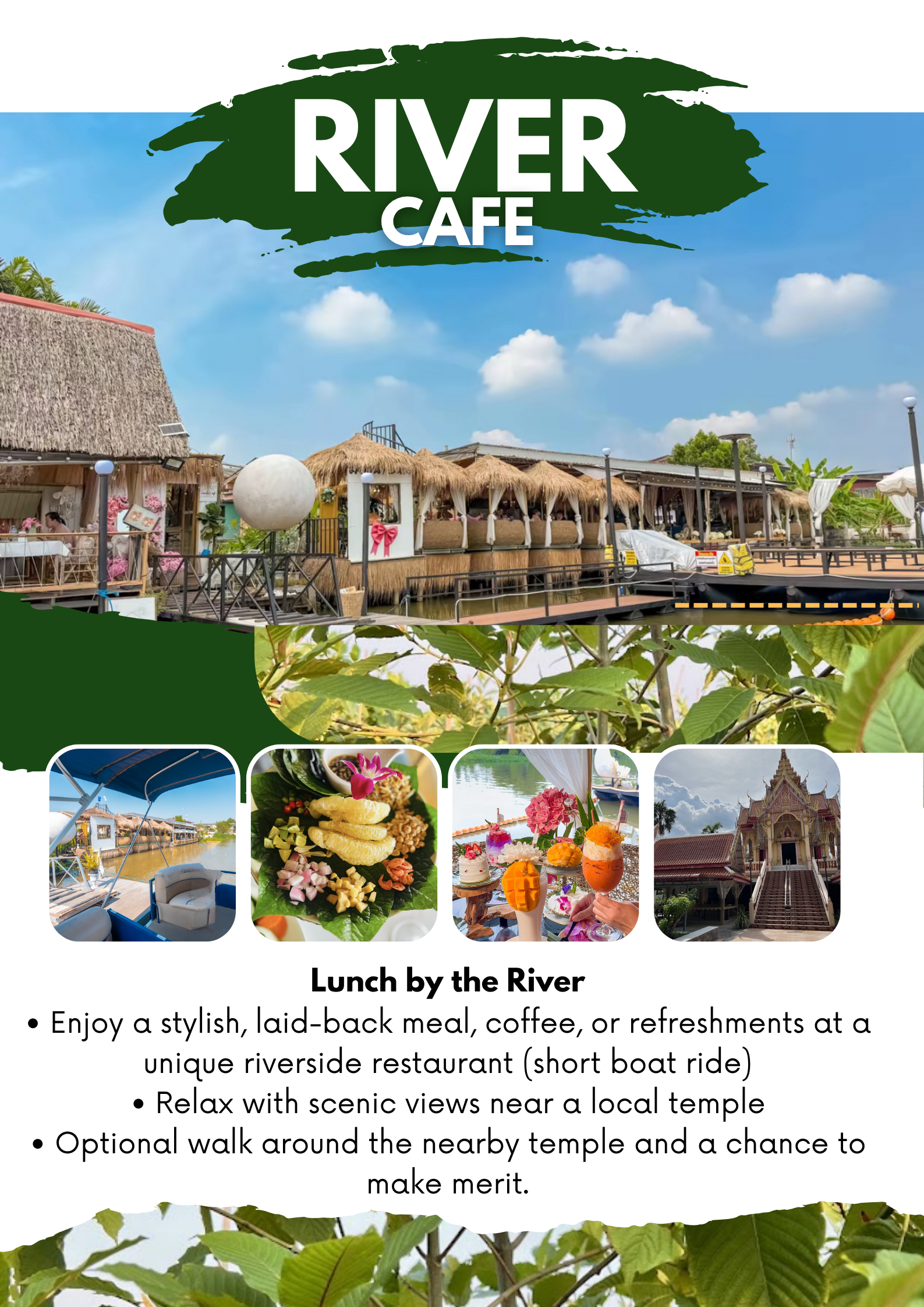 • Riverside Lunch Stop – Short boat ride to enjoy smoothies, coffee & Thai lunch.